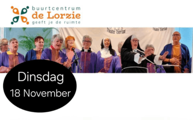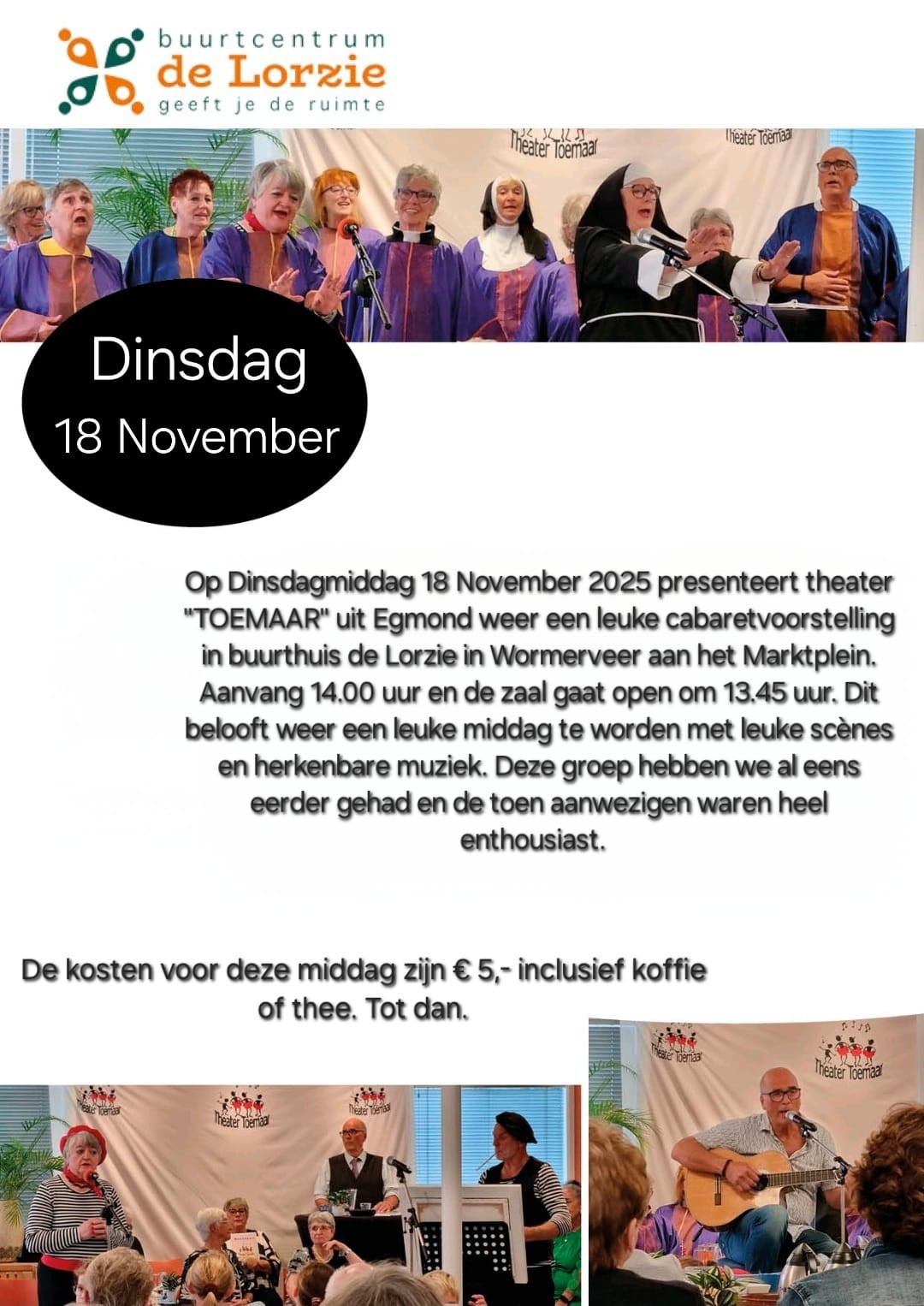 Op dinsdagmiddag 18 November 2025 presenteert theater “TOEMAAR” uit Egmond weer een leuke cabaretvoorstelling in buurthuis de Lorzie in Wormerveer aan het Marktplein.